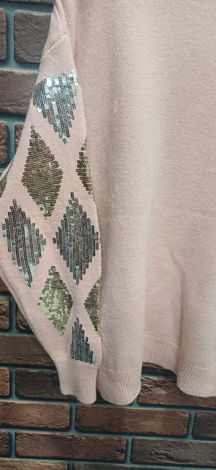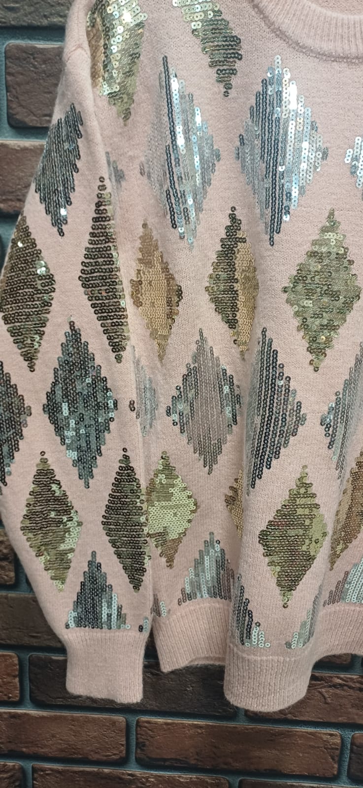 Color Palette: Soft blush pink knit base with gold, silver, and pewter-toned sequins.