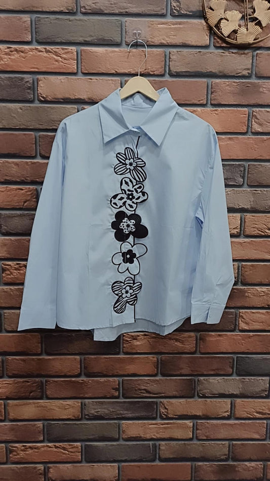 Cotton Shirt with Floral Scalloped Embroidery , POWDER BLUE