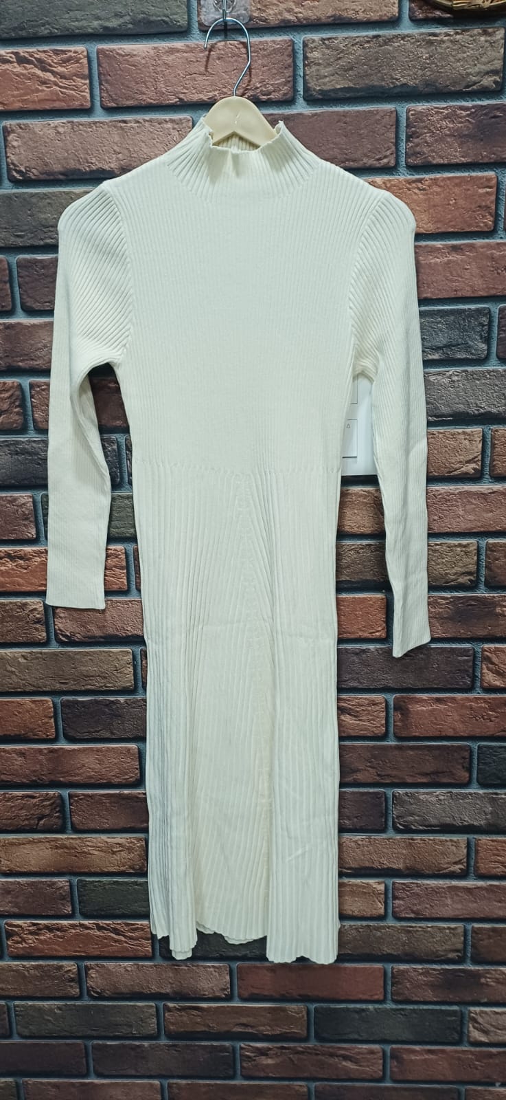 Ribbed Knit Midi Dress: A beautifully soft, long-sleeve knit dress in a versatile off-white or cream shade. The fine ribbed texture offers a flattering, figure-skimming silhouette, falling to an elegant midi length.